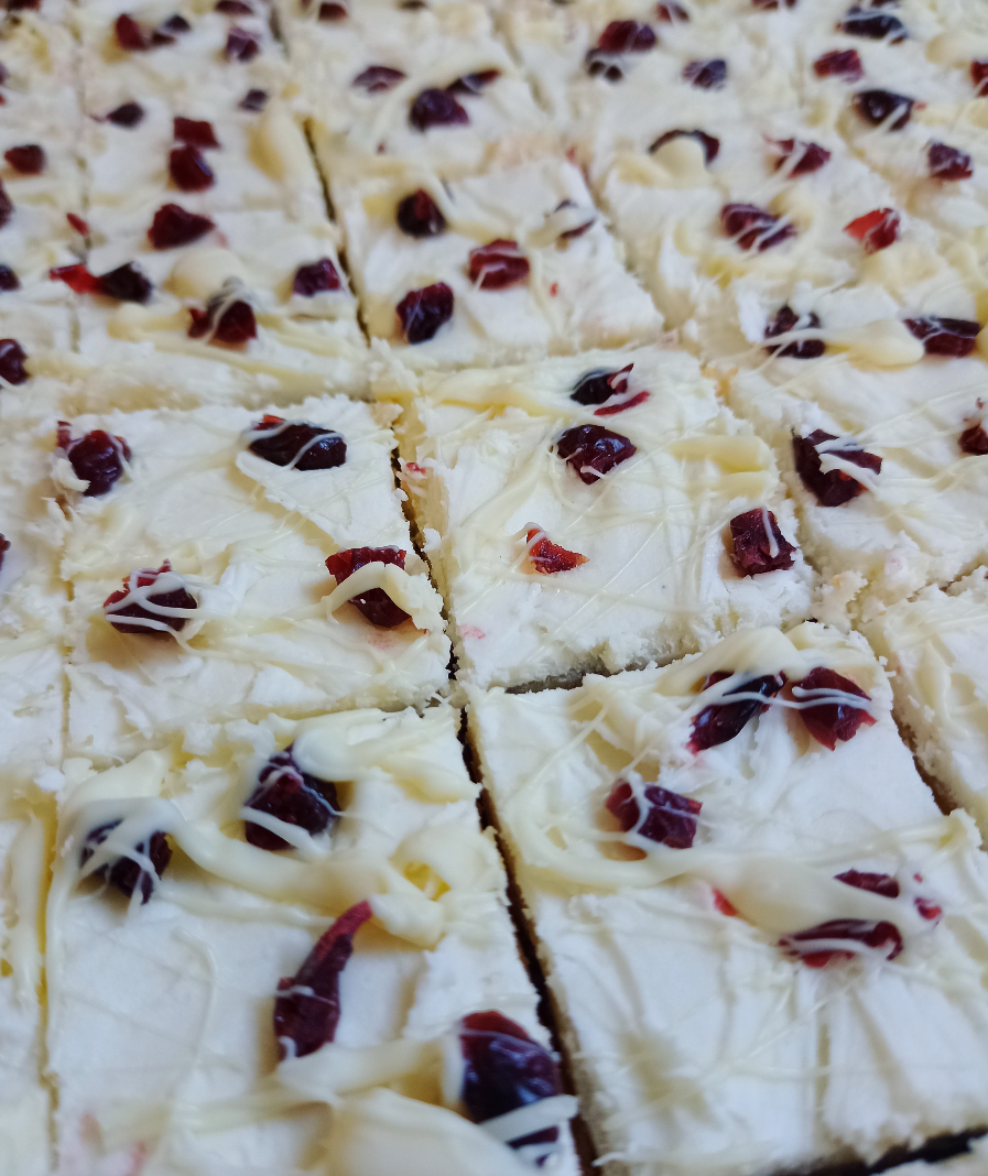 Cranberry and white choc chunk blondie — Creamy white chocolate blondie, studded with piles of sharp dried cranberries and chunks of smooth, sweet white chocolate. Topped with a cream cheese frosting then finished with more dried cranberries and white chocolate shaving.