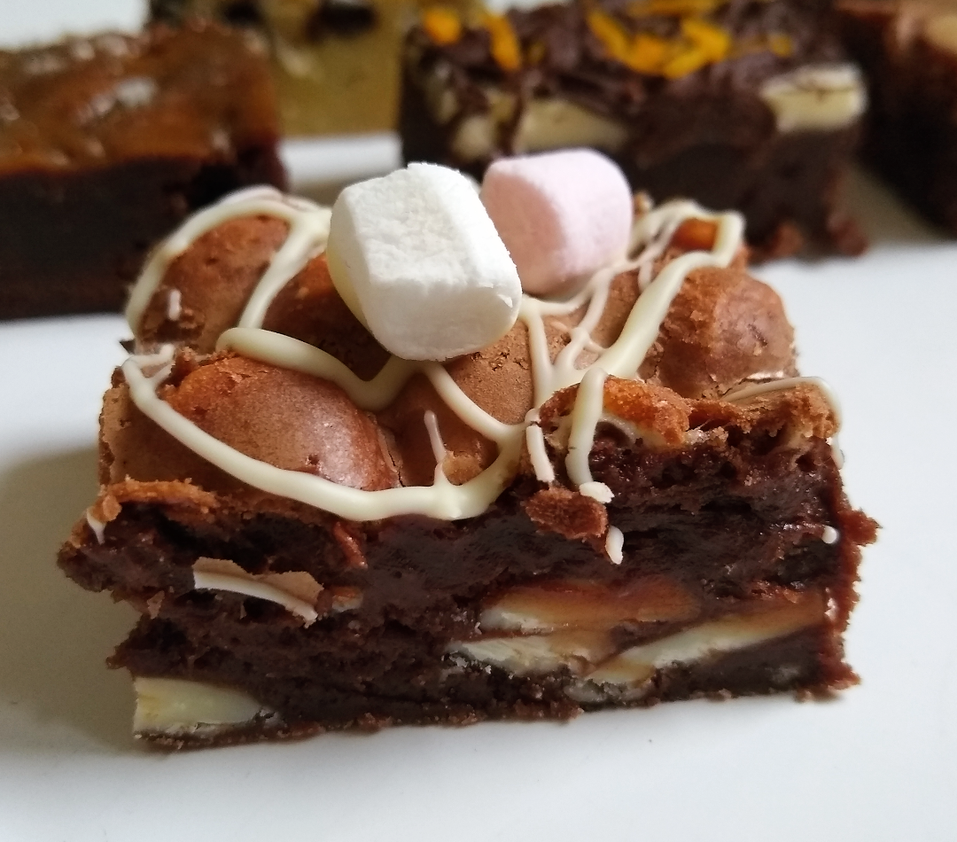 Mars bar — Plied with a veritable heap of chopped up Mars bars. Baked to fudgy, chewy perfection, and then finished with some more.