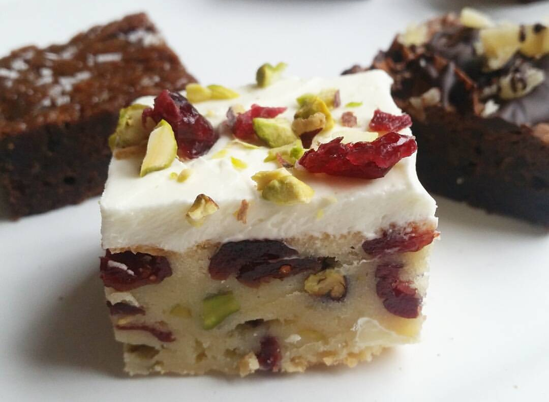 Our white chocolate blondie, heavily laden with raspberries and white chocolate chunks. Sharp, juicy raspberries, chunks of smooth, sweet white chocolate and creamy vanilla blondiness.