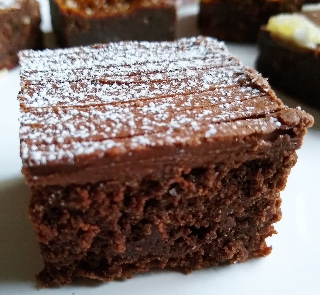 Bob’s Original Brownie. Our plain, unadulterated, rich, chocolatey, fudgy, gorgeously simple brownie. Topped with dredged icing sugar.