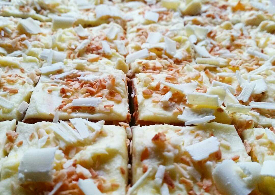 Our white chocolate blondie, heavily laden with raspberries and white chocolate chunks. Sharp, juicy raspberries, chunks of smooth, sweet white chocolate and creamy vanilla blondiness.