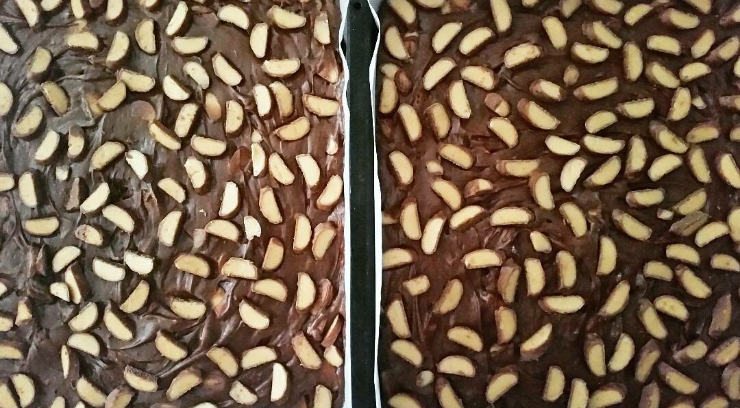 Stuffed with chopped toblerone and freshly toasted flaked almonds. Topped with melted toblerone and more toasted almonds. Nubbly, almondy, rich and fudgy.
