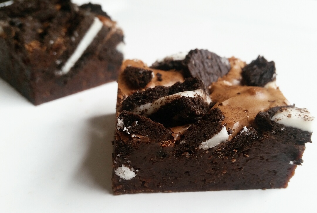 A dense and dark chocolate brownie with a layer of peppermint cream, topped with smooth, rich, dark chocolate. A fudgy brownie take on an after eight!