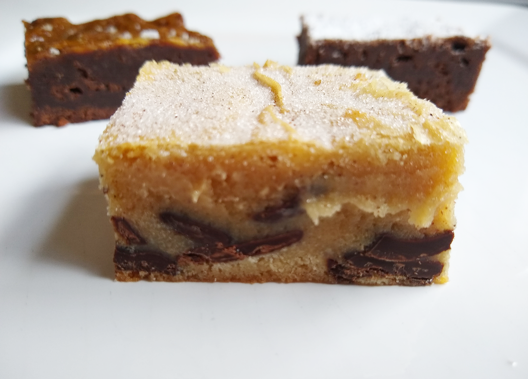 Churro choc chunk blondie — Creamy white chocolate blondie made churro-ey with brown sugar and cinnamon, and turned inside out by adding heaps of dark chocolate chunks throughout – no dipping required. Delicious when warmed up a little to achieve churro meltiness.