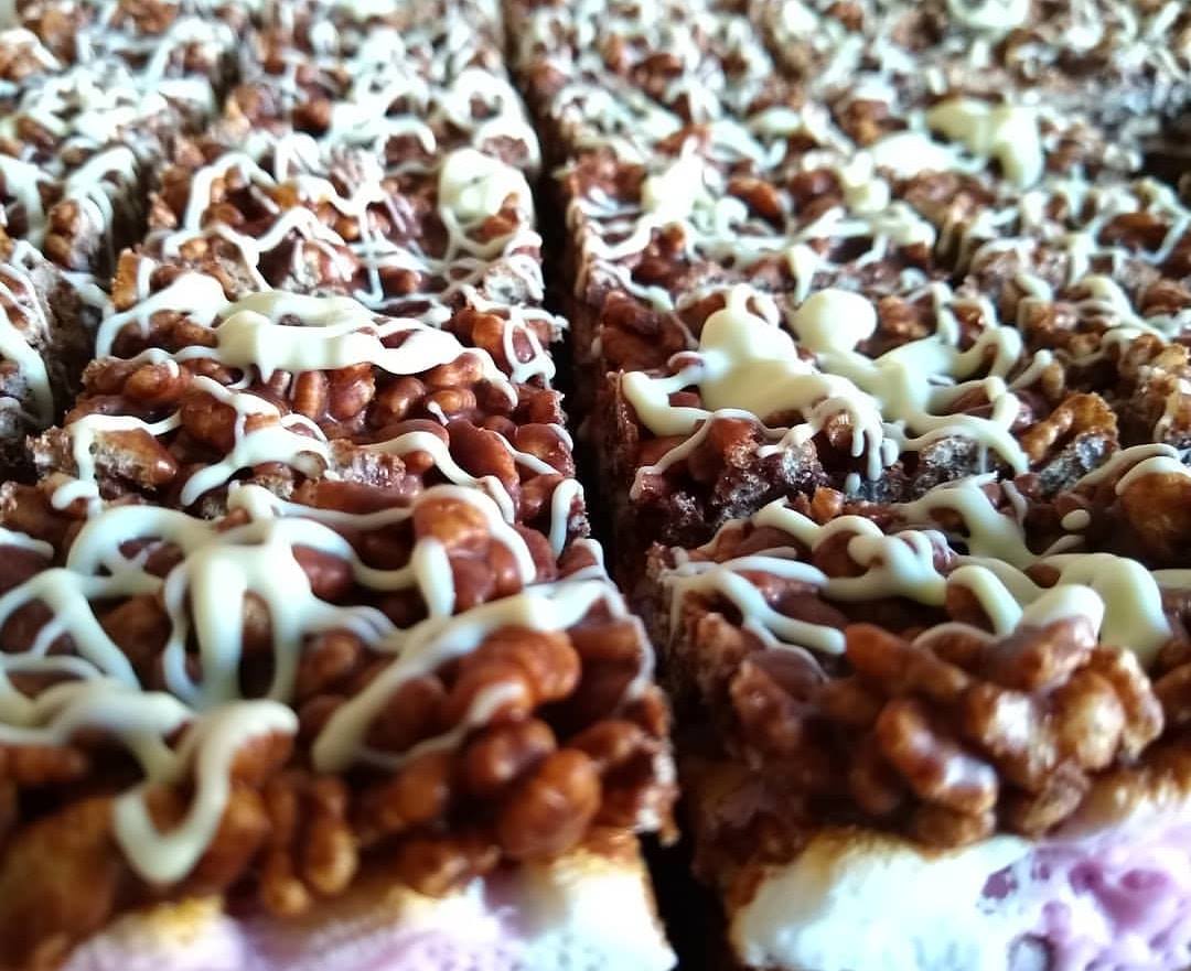 Choco krispie marshmallow & white choc chunk — Classic BOB studded with white chocolate chunks, topped with a layer of freshly toasted marshmallows, covered with our sticky, gooey chocolate rice krispie, and finally.. finished with a white chocolate drizzle